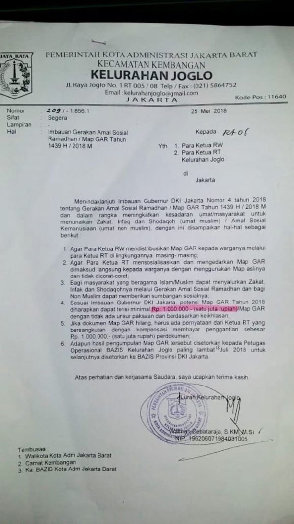 Lurah Joglo Soal Edaran Target Zakat Rp 1 Juta: Hanya Imbauan